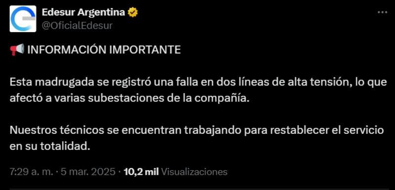 "Informamos que se produjo una falla en una línea de alta tensión que afecta a varias de nuestras subestaciones. Nuestros técnicos se encuentran trabajando para reestablecer el servicio", explicaron desde Edesur.