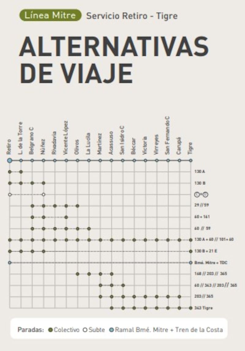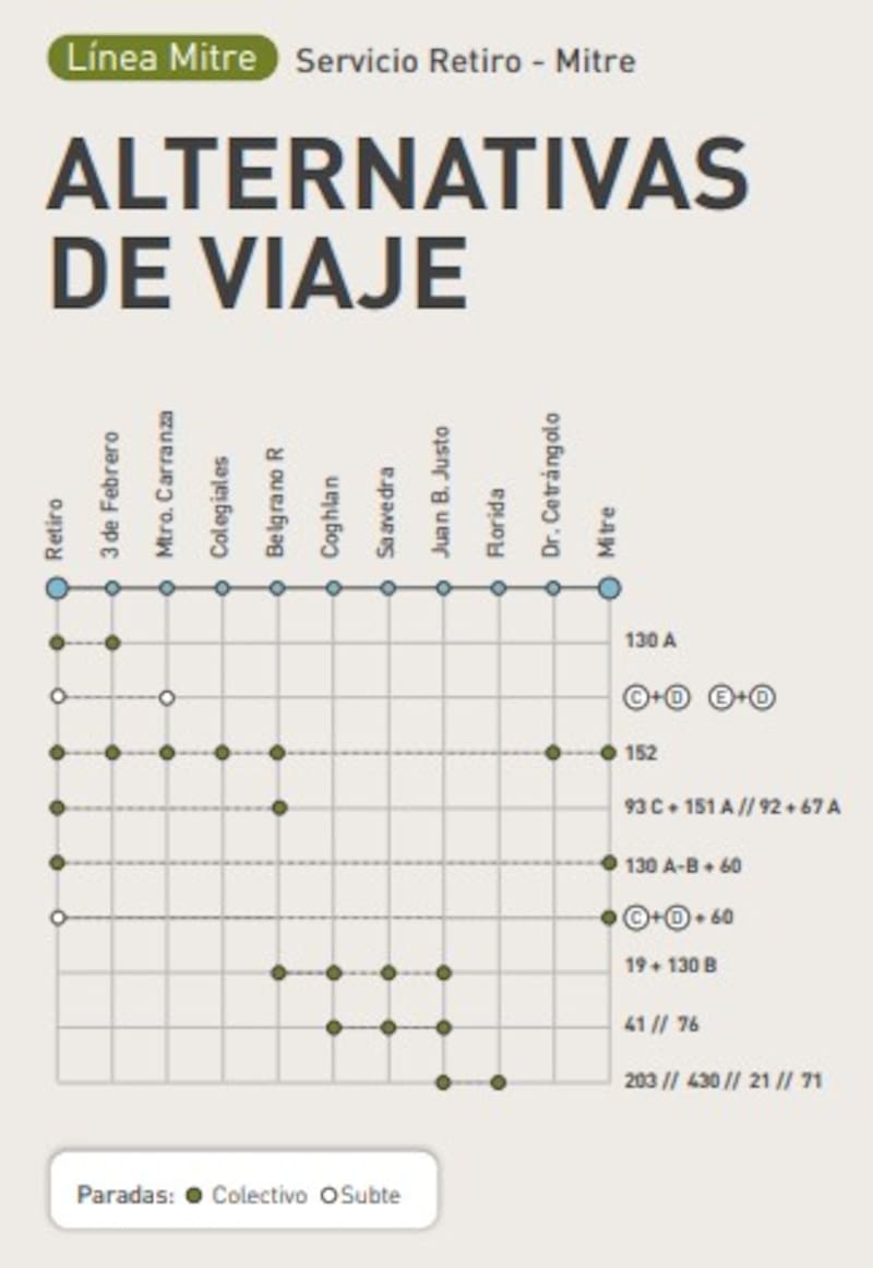 Para los usuarios afectados, la empresa diagramó tres alternativas de viaje diferentes en la que se combinan tren, subte y colectivos. Estas son las opciones que pueden elegir los usuarios: