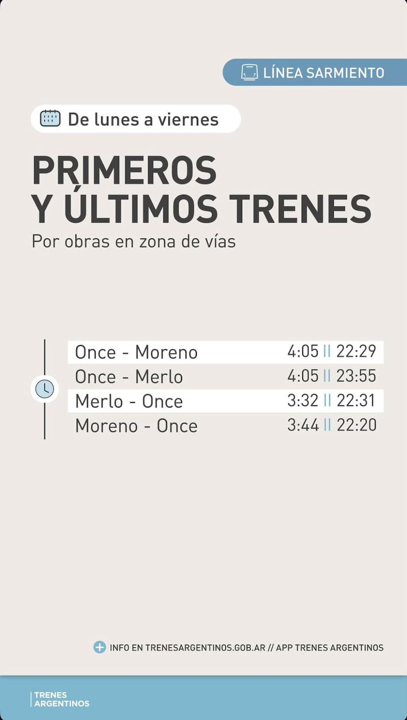 En el ramal Once–Merlo, el servicio iniciará a las 4:05 y finalizará a las 23:55, mientras que en el retorno el primer tren será a las 3:32 y la última salida se realizará a las 22:31.