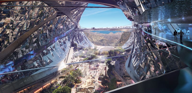 - Superficie y diseño: Trojena abarcará 60 km² en la cordillera Sarawat, con altitudes superiores a 2.600 metros, lo que permite temperaturas bajo cero en invierno.