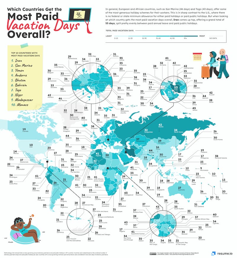 Los datos muestran que Irán ocupa el primer lugar mundial, otorgando un total de 53 días de descanso pagados al año. Completan el top 3, San Marino con 46 y Yemen con 45.