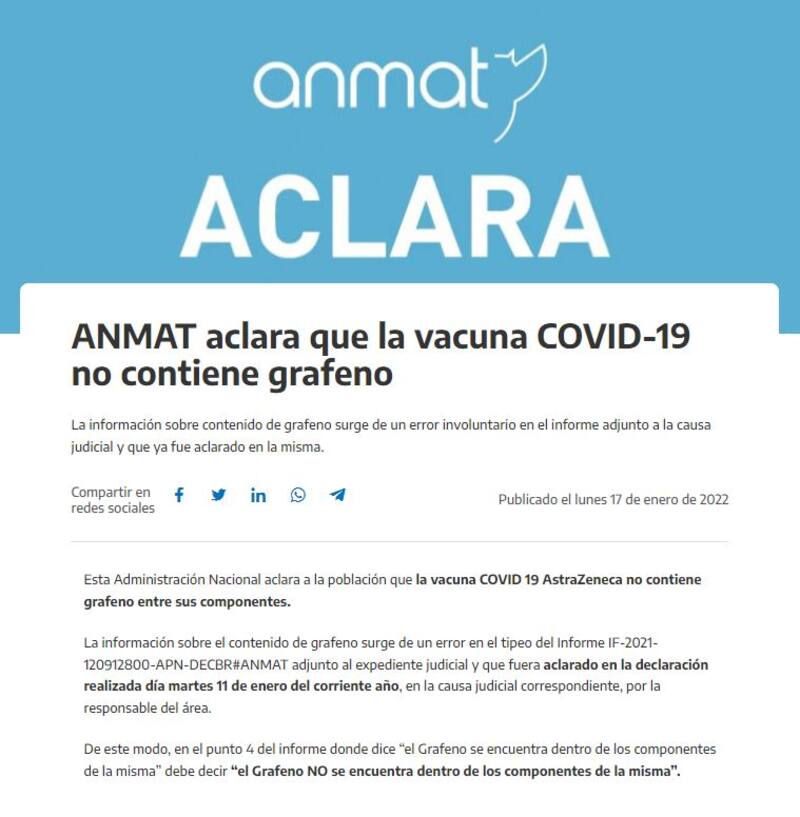 ANMAT explicó que "la información sobre el contenido de grafeno surge de un error en el tipeo del Informe IF-2021-120912800-APN-DECBR#ANMAT adjunto al expediente judicial y que fuera aclarado en la declaración realizada día martes 11 de enero del corriente año, en la causa judicial correspondiente, por la responsable del área".