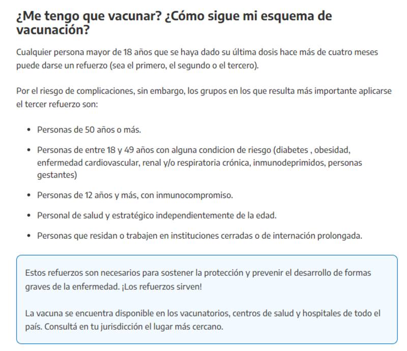 Desde la cartera conducida por Carla Vizzotti indicaron que cualquier persona mayor de 18 años que se haya dado su última dosis hace más de cuatro meses puede darse una vacuna de refuerzo.