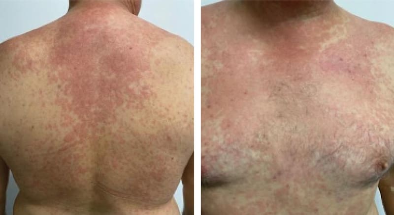 La mayoría son generalizadas y simétricos donde se inician las máculas ligeramente descamativas. Se presentan con frecuencia asociados con la ingesta de medicamentos como la hidroxicloroquina, el lopinavir/ritonavir y la azitromicina.