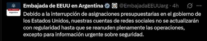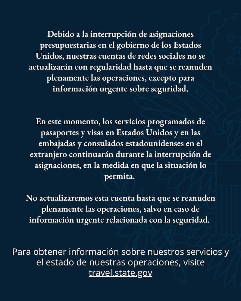La Embajada de Estados Unidos en Argentina emitió un comunicado oficial en el que aclara que, a pesar del cierre, los servicios consulares como la emisión de visas y pasaportes continuarán operativos "en la medida en que la situación lo permita".