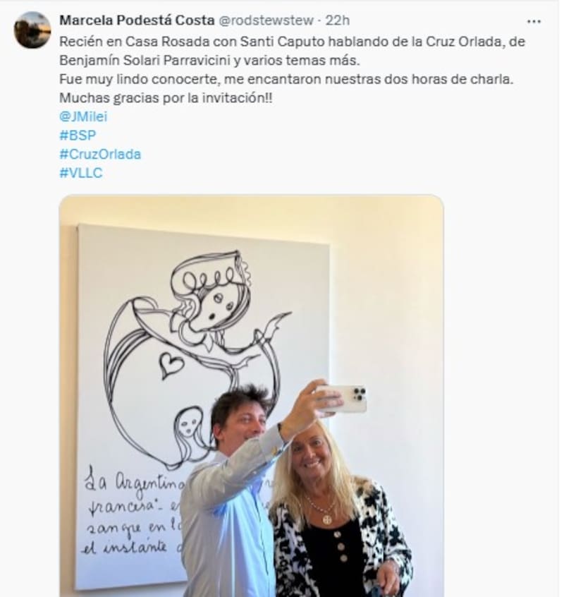Marcela Podestá Costa, sobrina nieta de Benjamín Solari Parravecini, se reunió en la Casa Rosada con el consultor político Santiago Caputo. La invitada llevó un regalo para el presidente Javier Milei, una "Cruz Orlada" hecha por un platero de San Antonio de Areco.