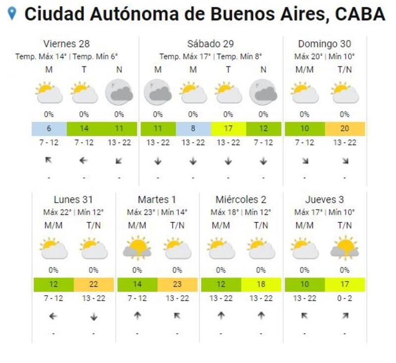 Según el pronóstico del SMN, el sábado 29 de julio el cielo continuará parcialmente nublado, con viento norte y una temperatura de 8 grados de mínima y 17 grados de máxima.En tanto, para el domingo 30, se espera que la temperatura suba aún más. También con cielo parcialmente nublado, se pronostica una mínima de 10 grados y una máxima de 20 en el Área Metropolitana de Buenos Aires.