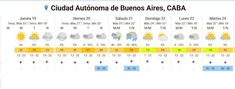 - Sábado 21: mínimas de 22° y máximas de 25°. Alerta por tormentas.