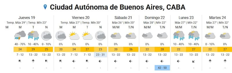 - Jueves 19: tormentas y temperaturas de entre 24° y 29°.