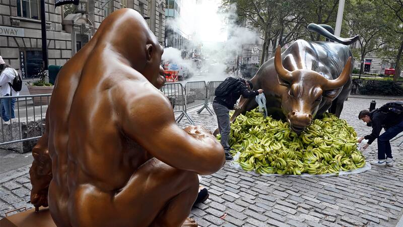 Un peculiar acto se vivió en Wall Street durante las últimas horas, cuando una escultura de bronce del gorilla Harambe fue instalada frente a la estatua del "Charging Bull", considerada por muchos como un símbolo del capitalismo y un talismán de buena suerte para las inversiones. A esto se le sumó que el toro fue rodeado con alrededor de 10.000 bananas en un acto que tomó por sorpresa a quienes visitaban la zona.