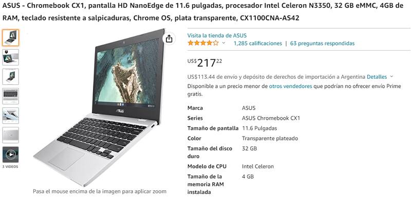 Por ejemplo, una ASUS - Chromebook CX1 con pantalla HD NanoEdge de 11.6 pulgadas puede conseguirse por tan sólo a u$s 217 en la plataforma estadounidense. Al ser un producto extranjero, a este precio se le deben sumar el impuesto PAIS (30%) y el anticipo del Impuesto a las Ganancias (45%).