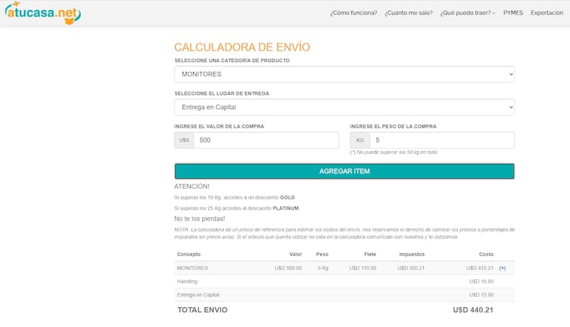 El mismo producto, entregado por ATuCasa, tiene un costo menor. El costo Amazon pesificado queda en $ 3157. A esto se suma el costo de envío, $ 2583, lo que da un total de $ 5740.