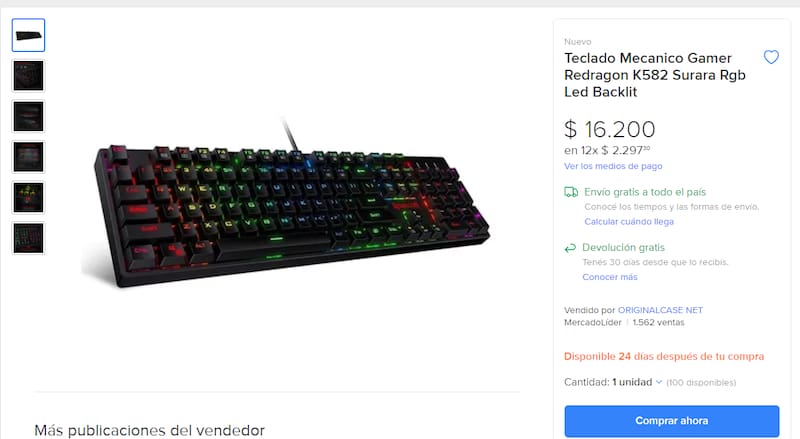 Uno de los productos gamer más buscados son los teclados de alta performance, preferiblemente, mecánico. En MercadoLibre, se consigue un Redragon K582 con retroiluminación por $ 16.200.