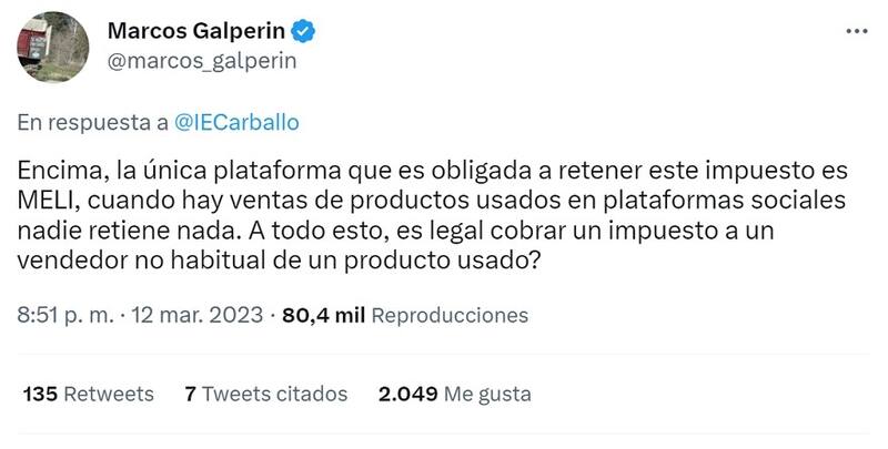 Tras darse a conocer la carga, Galperín lanzó: "A todo esto, ¿es legal cobrar un impuesto a un vendedor no habitual de un producto usado?". Además, cuestionó que "la única plataforma que es obligada a retener este impuesto es Mercado Libre".
