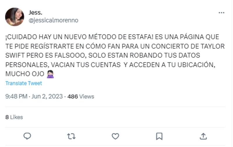 "Cuidado hay un nuevo método de estafa! Es una página que te pide registrarte como fan para un concierto de Taylor Swift pero es falso, sol están robando tus datos personales, vacían tus cuentas y acceden a tu ubicación", escribió una joven en la red del pajarito azul.