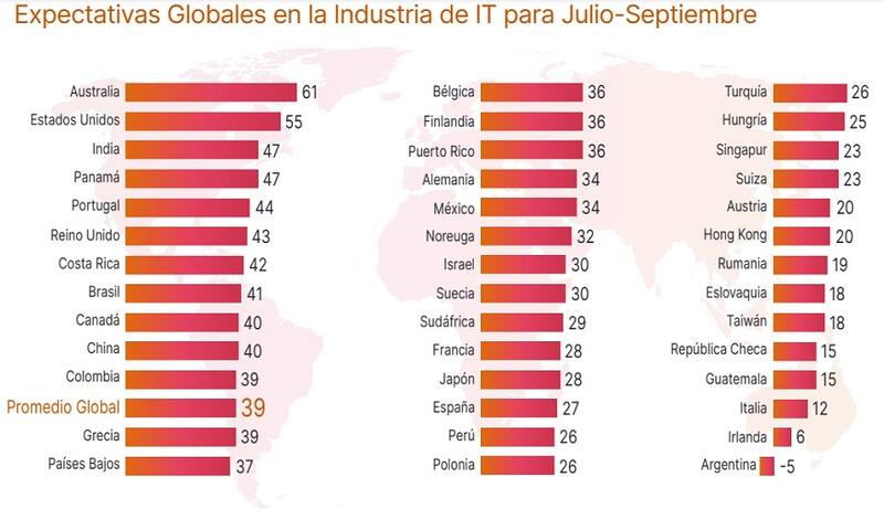 En el caso del país, parece ir a contramano de lo que sucede en la región. Diez de los once países de América esperan aumentos en su nómina de IT para el próximo trimestre. Estados Unidos presenta las expectativas más altas de la región (+55%), seguido por Panamá (+47%) y Costa Rica (+42%). En el caso específico de Argentina, es el país que arroja las expectativas más débiles de la región y del mundo (-5%), seguido por Guatemala (+15%) y Perú (+26%).