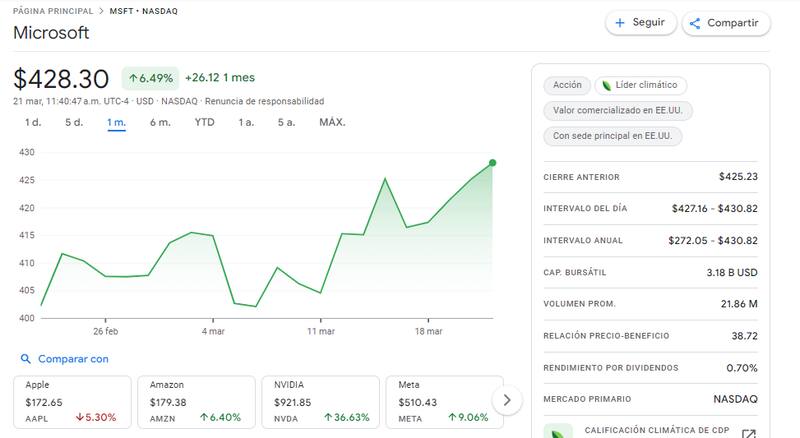 Es una estrategia comprensible, dado que Microsoft es una de las principales empresas impulsoras de la innovación en inteligencia artificial, con una amplia gama de aplicaciones y tecnologías en este campo. En el último mes, los títulos de la compañía crecieron por más de 26% y actualmente operan a u$s 428,83.