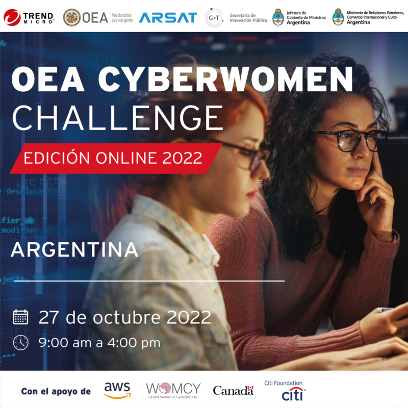 El evento se realizará en Argentina el próximo jueves 27 de octubre y cuenta con el apoyo de la Organización de Estados Americanos (OEA), Trend Micro Incorporated, la Secretaría de Innovación Pública de la Jefatura de Gabinete de Ministros, a través de la Dirección Nacional de Ciberseguridad; el Centro de Géneros en Tecnología (G+T), el Ministerio de Relaciones Exteriores, Comercio Internacional y Culto; y ARSAT.