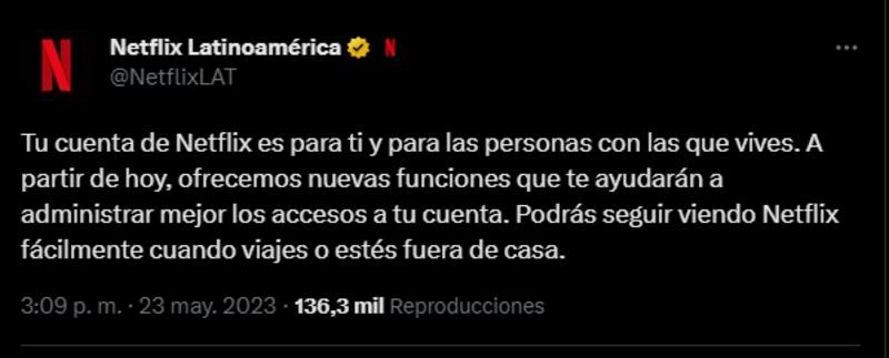 "Todas las personas que vivan en ese hogar pueden acceder a Netflix desde dondequiera que estén (en su casa, de vacaciones o de viaje) y hacer uso de nuevas funciones como 'Transferir un perfil' o 'Administrar accesos y dispositivos'", informó la empresa mediante un comunicado.