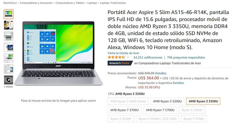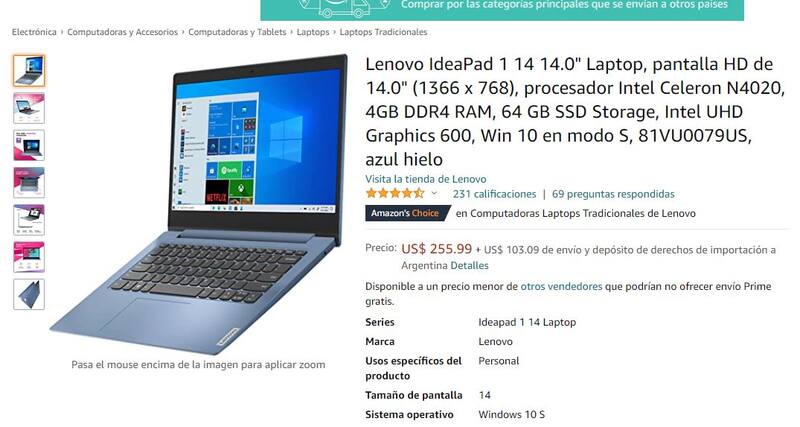 Una notebook de similares características se puede encontrar en Amazon a US$ 318.