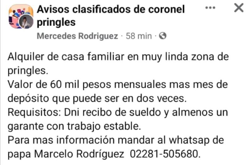 La mujer de Pringles que se vio envuelta en esta estafa pudo verificar que los posteos de este tipo aparecen en más de 5 grupos de Facebook vinculados al alquiler de casas sin intermediarios. Es por esto que hace faltar prestar más atención a los anuncios y desconfiar de los pagos por adelantado.