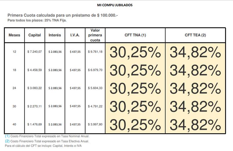 En el caso del Plan Mi Compu para jubilados y pensionados de ANSES y Banco Nación, la tasa efectiva anual y el costo financiero total es de 34,82%. Entonces, las cuotas, según la entidad financiera, quedarían de la siguiente manera: