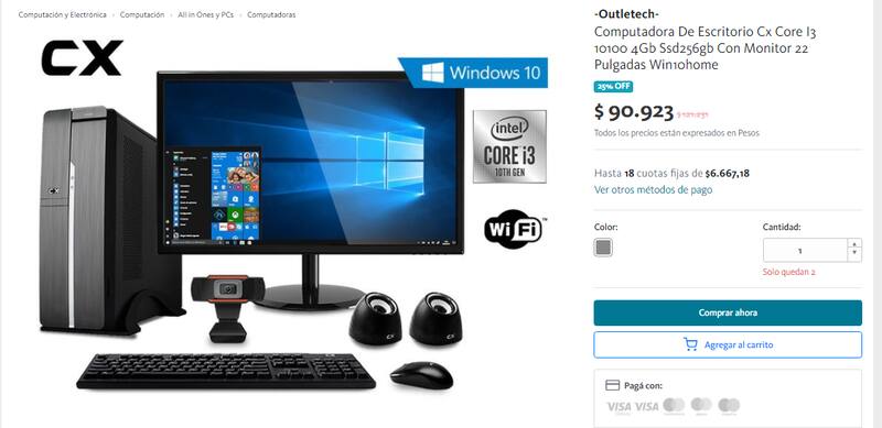 Este modelo integra procesador Intel Core i3 de décima generación, Windows 10, 4 GB de RAM y 256 GB de almacenamiento. Incluye monitor, gabinete, teclado, ratón, parlantes y cámara web.