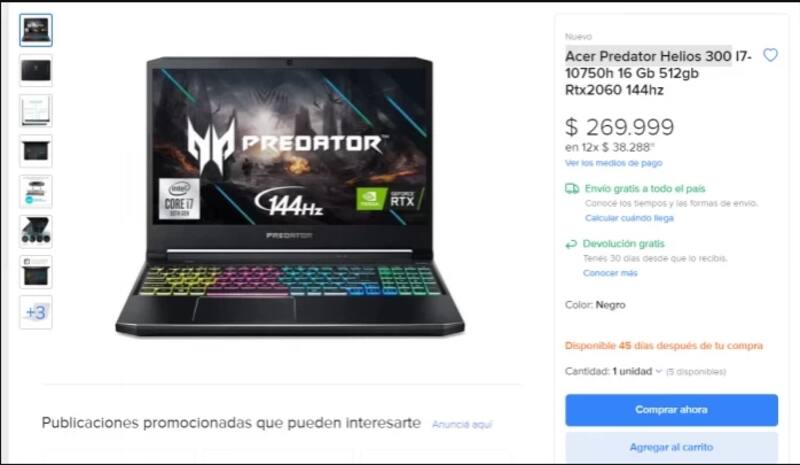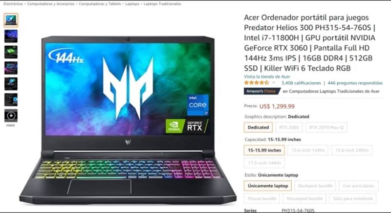 Por caso, una Hacer Predator Helios 300; una máquina con procesador I7, una poderosa placa de video GeForce RTX 3060 y 16 GB de ram se consigue en el mercado internacional por US$ 1300. En cambio en las tiendas argentinas, se consigue un modelo de menor calidad (trae una placa 2060) por $ 270.000.