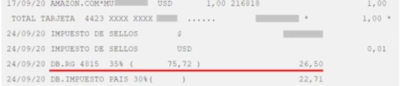 En el caso de realizar compras en dólares con tarjeta, la percepción aparecerá en el pie del resumen de tu tarjeta de crédito con las siglas "DB.RG 4815 35%".