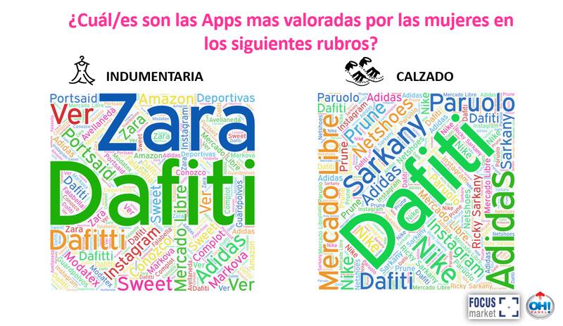 En posición de la demanda en plataformas digitales a través de Apps en el Top 5 de las más valoradas por las mujeres al momento de comprar Indumentaria y Calzado se encuentran en indumentaria Zara, Dafiti, Ver, Portsaid y Mercado Libre, mientras que en calzado Dafiti, Sarkany, Paruolo, Adidas y Mercado Libre.