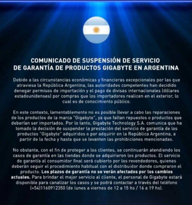 En relación con la garantía, y dado que en las redes sociales causó mucha confusión el comunicado de Gigabyte, cabe aclarar que aquellos que tengan algún problema tendrán que ir a reclamar a quien le hayan comprado el hardware y reclamar la garantía personalizada. O sea: todo esto no significa que la garantía no vale, sino que el proceso de reparación que brindaba Gigabyte -que aceleraba mucho los tiempos- por el momento no funciona. Si la situación cambia, esta decisión podría revertirse, dado que la marca seguirá operando en el país, según fuentes del sector.