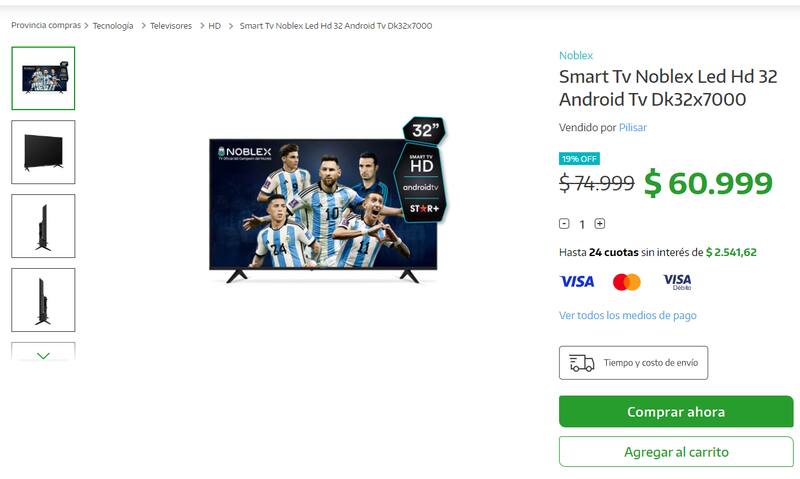 En el sitio, por caso, se pueden encontrar ofertas como el televisor LED de 32 pulgadas de la marca Noblex. El mismo viene con un 19% de descuento lo que lo deja con un precio final de $ 61.000. El producto se puede conseguir en 24 cuotas sin interés.