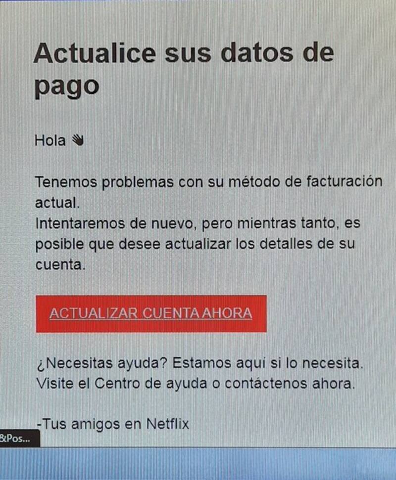 Se conoció recientemente una estafa de Netflix que engaña a los usuarios para que entreguen sus tarjetas de crédito. El mail llega diciendo que la plataforma necesita que se actualicen los datos del usuario, luego, le pide a la víctima que ingrese sus datos de ingreso a la la plataforma. Ahora, los estafadores tienen acceso a la cuenta de Netflix de la víctima.