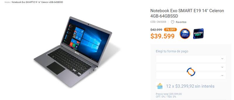 En primer lugar, el vendedor Cetrogar vende notebooks en 12 cuotas sin interés y con descuentos entre el 5% y 7%. En tanto, la notebook Exo Smart E19 de 14 pulgadas y procesador Celeron cuesta $39.599 y puede comprarse en 12 cuotas de $3.299,92.