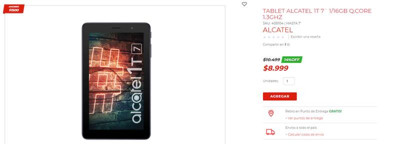 Por último, todas las tablets tienen un ahorro de hasta $7.500 y pueden conseguirse a través del sitio oficial. Por ejemplo, la tablet Alcatel 1T con pantalla de siete pulgadas cuesta $8.999 y está 14% OFF. En tanto, el retiro en sucursal es gratuito.