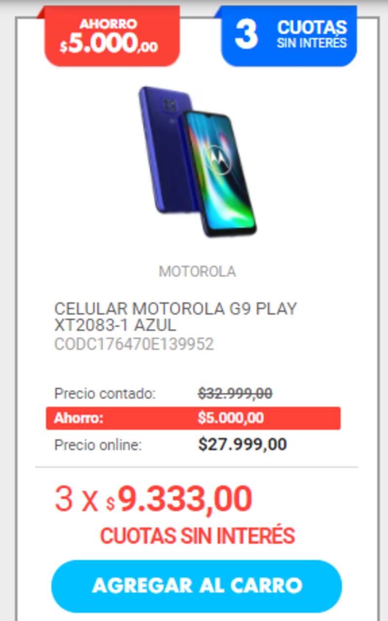 Por otro lado, Cetrogar vende 77 modelos de celulares en tres y nueve cuotas sin interés. Cuenta con marcas como TCL, LG y Motorola y rondan los $18.000 y alcanzan los $120.000. En esta misma línea, la empresa vende el smartphone gama media LG K20 a $14.999 y en nueve cuotas sin interés. Además, tienen en stock el nuevo Motorola E7 Plus a $23.799 (un 10% más barato, según la página) en tres cuotas sin interés.