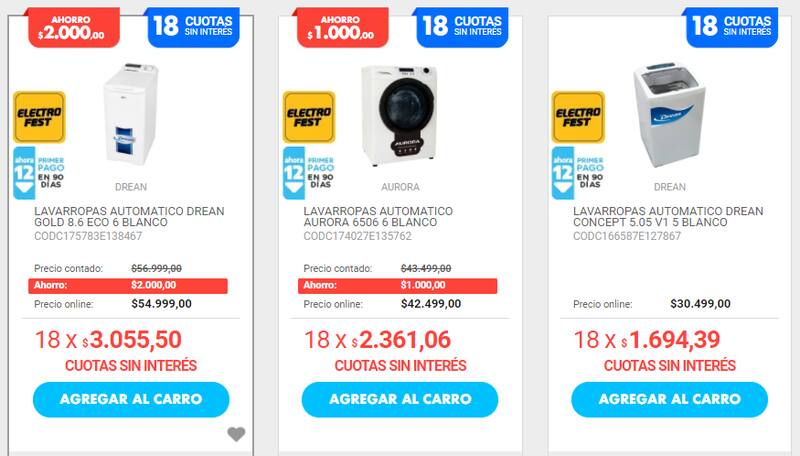 Por otra parte, ofrece 18 cuotas sin interés en equipos de aire acondicionados -los precios de los electrodomésticos comienzan en $41.000 y alcanzan los $99.999. Además, venden heladeras en 18 cuotas sin interés; microondas y lavarropas en 12 cuotas sin interés y termotanques en 12 cuotas sin interés.