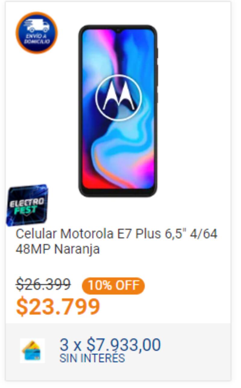 Además, hay varios smartphones disponibles en una, tres, seis, 12, 18 y 24 cuotas fijas. Por ejemplo, Musimundo vende el nuevo Motorola E7 Plus a $24.999. Por otro lado, el modelo Motorola G9 Play cuesta $27.999 y puede comprarse en tres cuotas sin interés.