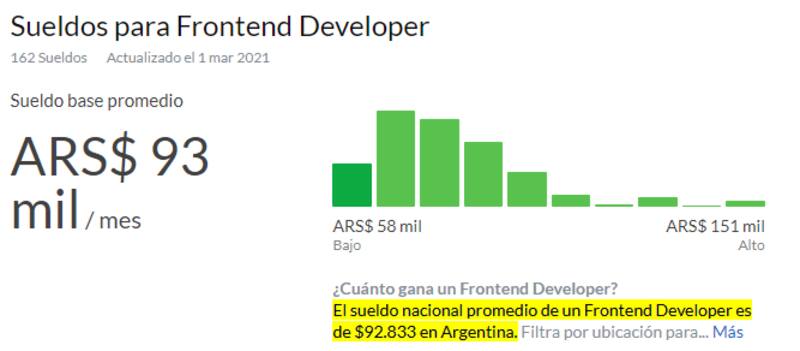 6. Analista front-end: un analista front-end tiene conocimientos en HTML5 y lenguajes como React JS y JavaScript. De acuerdo al mismo sitio, el salario básico de un junior ronda los $50.000 al mesy el sueldo promedio en la Argentina es $93.000 al mes.