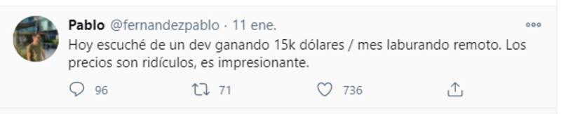 El tuit repercutió en la comunidad IT rápidamente. "Ya en el país hay empresas que pagan US$ 4.000. Vivís como un rey y te sobra. Es tremendo", respondió Damián Catanzaro, fundador de Cafecito.app. "Así es. Recibí dos ofertas por US$ 8.000 en los últimos meses", agregó Federico Frias, desarrollador iOS Swift. "Esos son sueldos de Silicon Valley". "Es lo que paga el mercado". "No es ningún disparate".
