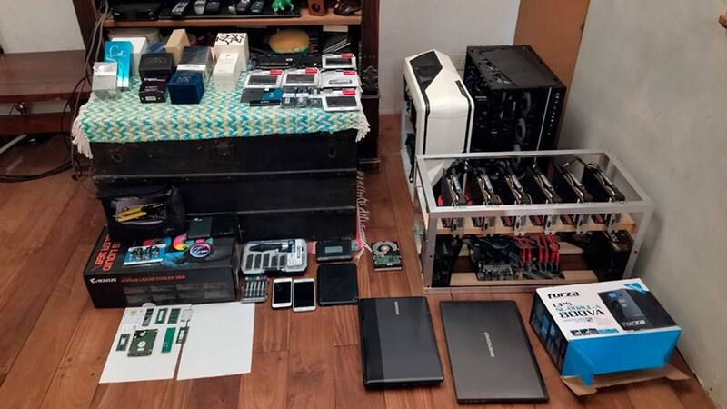 En una de las fotografías que tomó la policía en el allanamiento, pueden verse discos de almacenamiento, tarjetas de memoria, equipos UPS y; efectivamente, un rig de minería armado con placas de video.