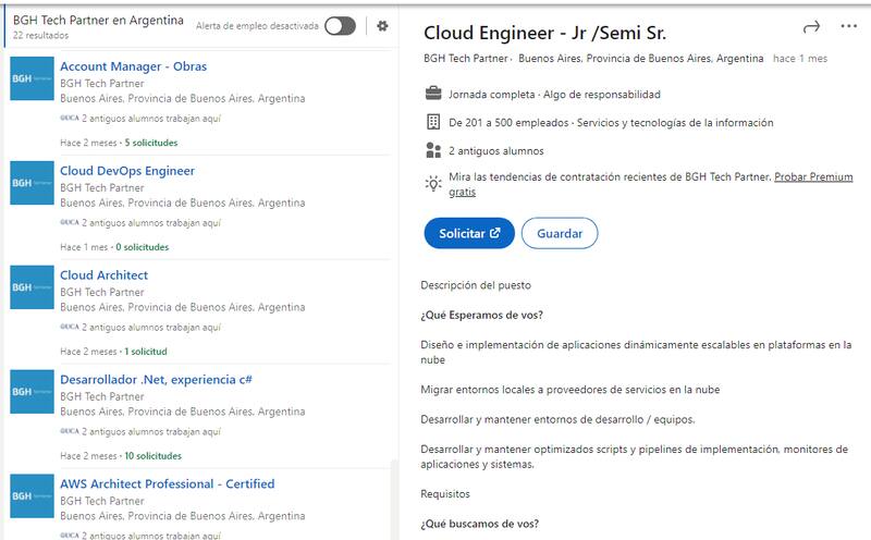 En la actualidad, BGH también está en la búsqueda de profesionales Cloud. A través de LinkedIn, la firma tiene más de 20 vacantes publicadas y quiere captar ingeniero en la nube DevOps, ingeniero de seguridad, arquitecto en la nube, arquitecto profesional certificado en Amazon Web Services, entre otros.