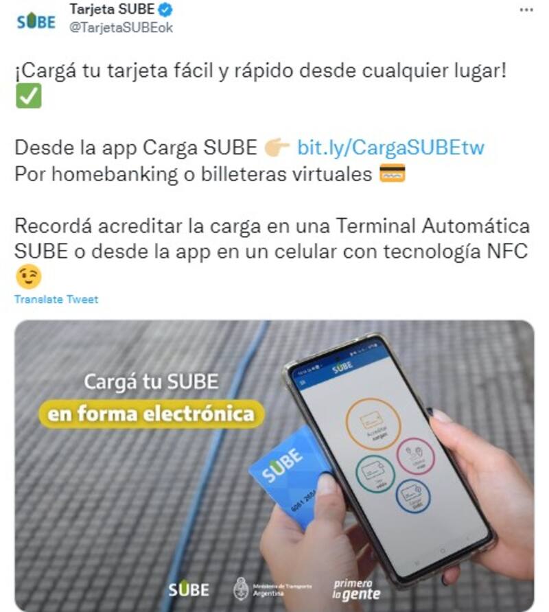 A través de Twitter, la cuenta oficial de SUBE comunicó a los usuarios una forma rápida y efectiva para cargar la tarjeta desde cualquier parte. Se trata de la "app Carga SUBE", compatible con los dispositivos de sistema operativo Android 4.3 o superior.
