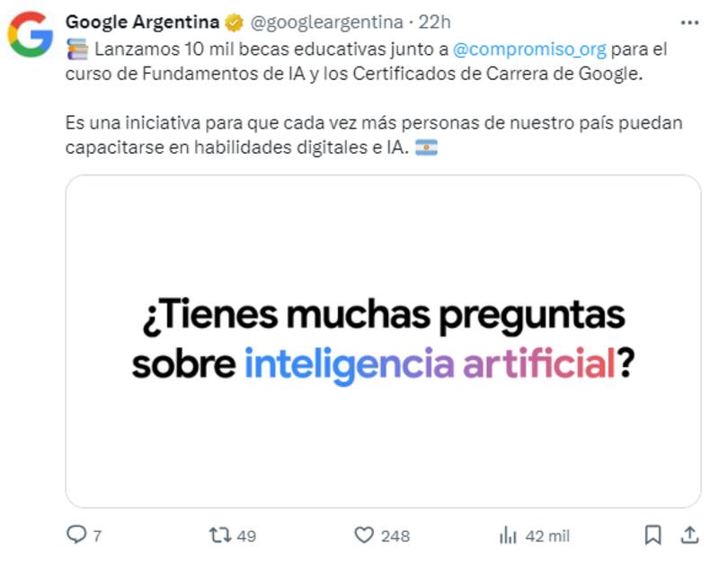 Google Argentina junto a la Fundación Compromiso lanzó 10 mil becas educativas para los cursos de Fundamentos de IA además de distintas certificaciones de carrera emitidas por la propia entidad.