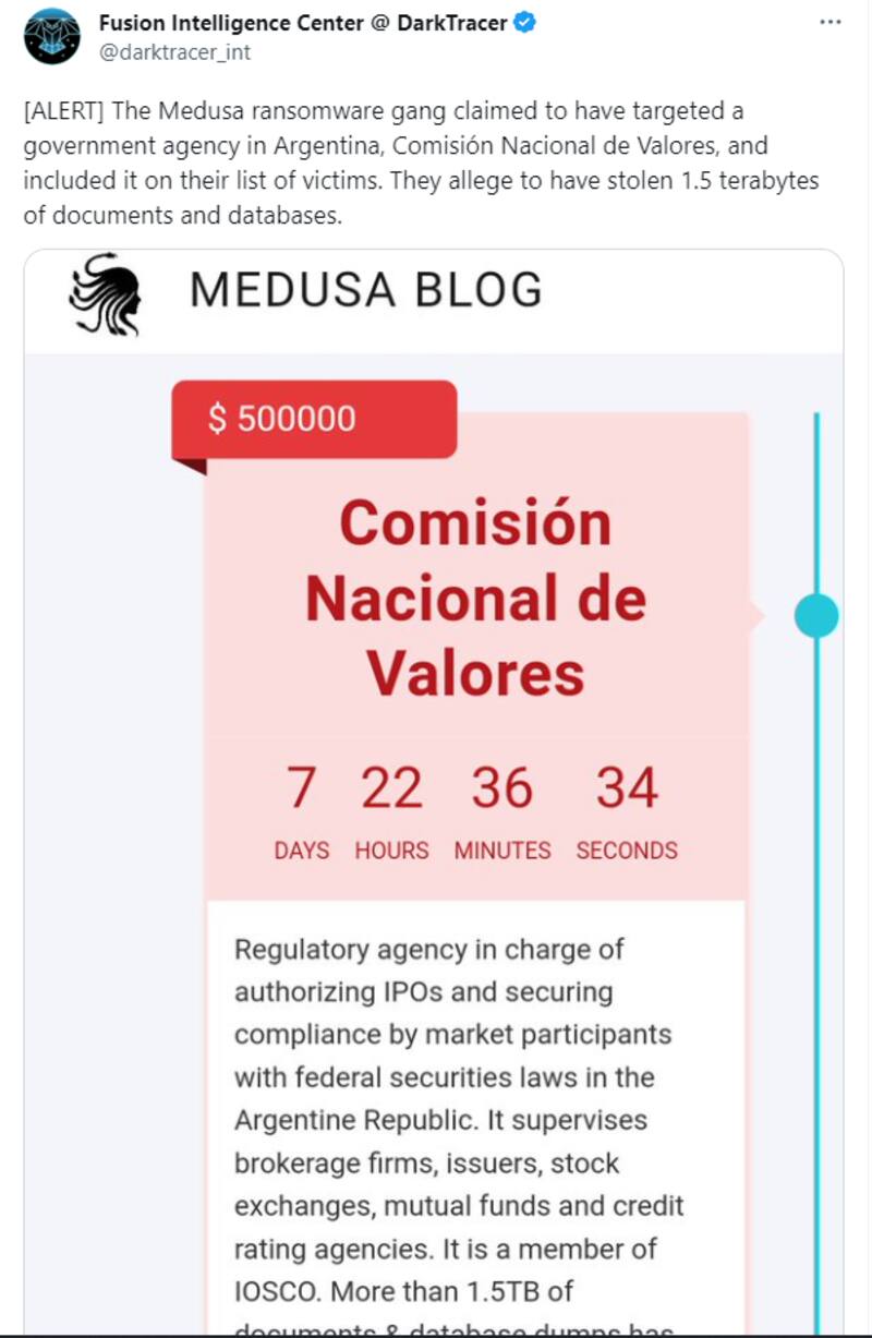 Según investigadores en ciberseguridad, la Comisión Nacional de Valores (CNV) fue atacada por el grupo de ransomware Medusa. El grupo dice tener más de 1,5 terabytes de documentos y bases de datos de la CNV. El grupo habría extorsionado a la entidad por u$s 500.000 -a pagarse en el plazo de una semana- para no filtrar documentos y bases de datos del organismo que regula los mercados financieros.