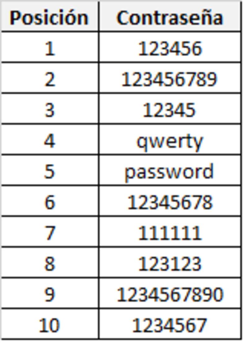 Según la misma fuente, ocho de las diez contraseñas más utilizadas están compuestas por varias combinaciones numéricas, particularmente "123456","123456789" y "12345" ocupan el primer, segundo y tercer lugar de la lista este año.