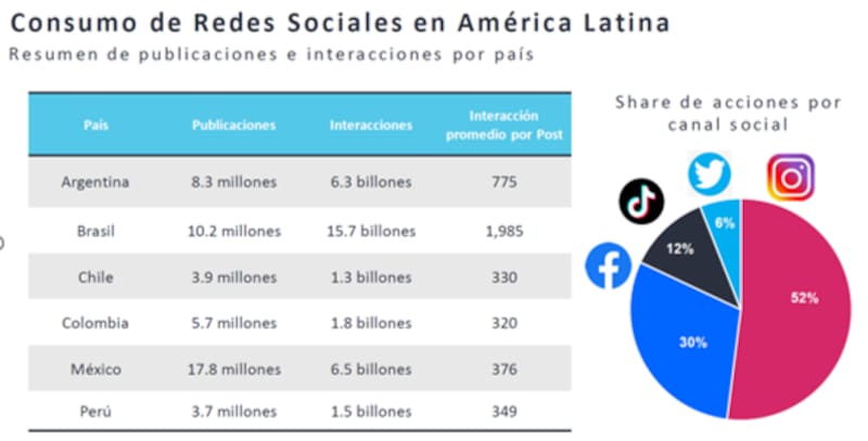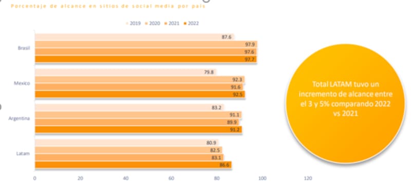 El estudio arrojó que el 9 de cada 10 latinoamericanos acceden a redes sociales y, en conjunto, realizaron 54.8 mil millones de publicaciones en Facebook, Twitter, Instagram y TikTok de enero a diciembre de 2022. Las publicaciones generaron 35.7 mil millones de interacciones por parte de la audiencia, equivalente a 100 millones de interacciones diarias durante 2022. Latinoamérica tuvo un incremento de alcance de entre el 3% y 5% comparando 2022 y 2021.