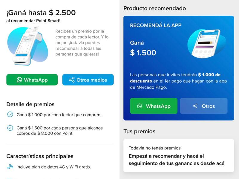 Una de las opciones para hacerse de ingresos con la app es recomendar Point Smart, el lector que utilizan los comercios para las ventas de sus productos. Al invitar a amigos o conocidos a sumarse en la adquisición del producto, se les acreditará a los usuarios de Mercado Pago un monto específico de dinero.