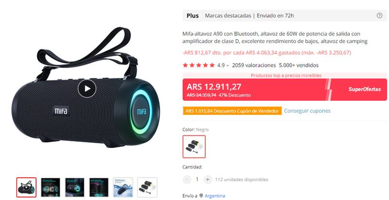 Por otro lado, Aliexpress también le regala a sus usuarios un descuento de casi el 50% en algunos parlantes portátiles como el Mifa-altavoz A90, que se ubica en torno a los $ 12.911,27 en la plataforma de e-commerce china.