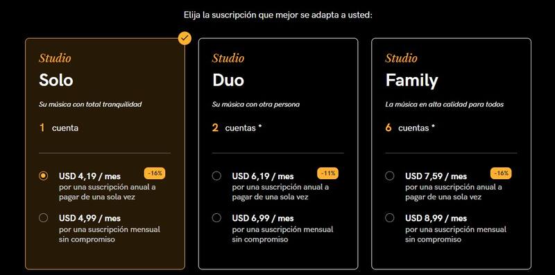 Qobuz da la posibilidad de pagar todo el año de una sola vez, con una rebaja, o por mes. Todos los planes incluyen el servicio de alta resolución, lo único que cambia es la cantidad de cuentas de cada uno.